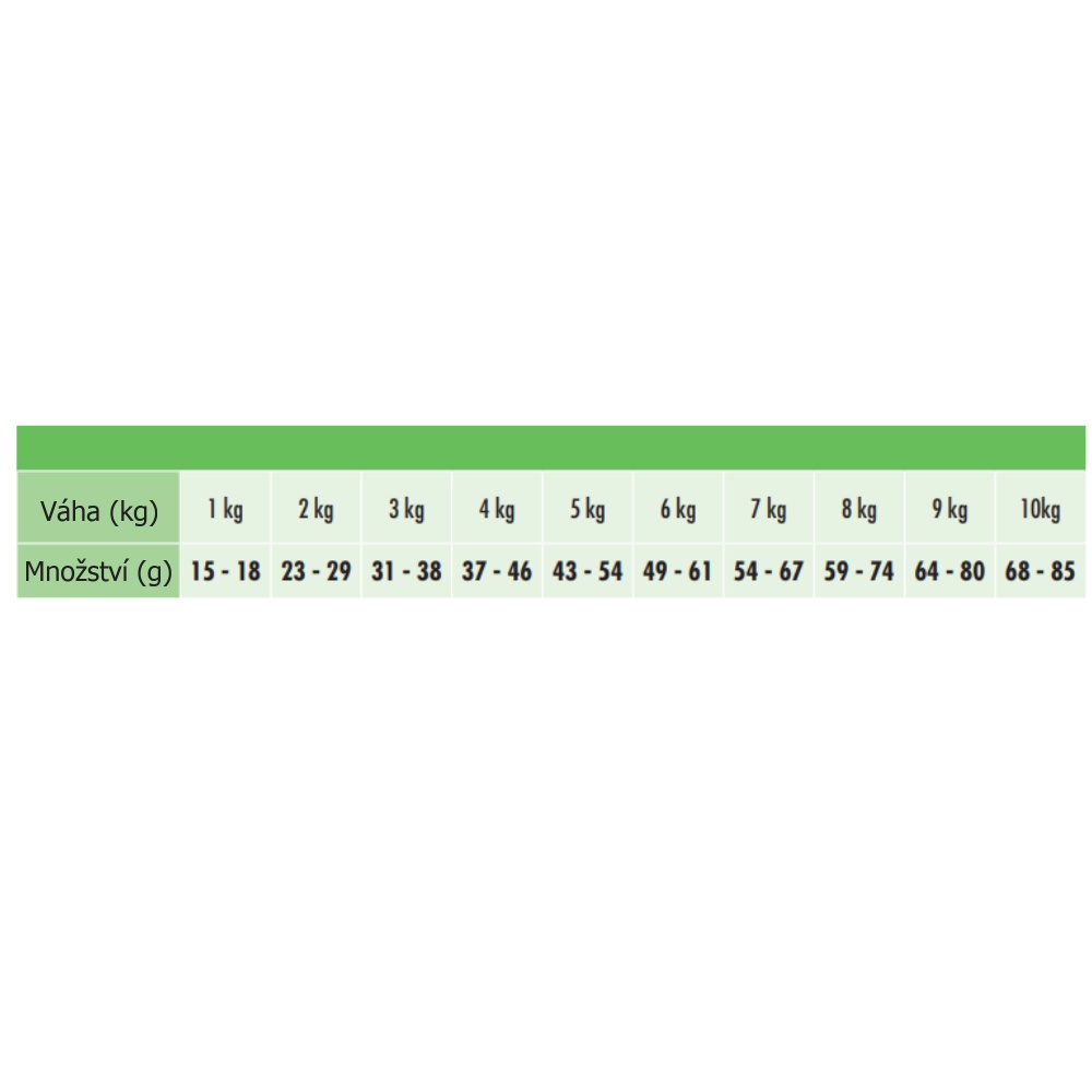 Zloženie: sušené živočíšne bielkoviny (z toho kuracie a morčacie 16 %), kukurica* (23 %), pšeničné krupice, obilná múka, hydrolyzované živočíšne bielkoviny, kurací tuk (kukuričný lepok, sušená dužina). * Prírodná zložka.