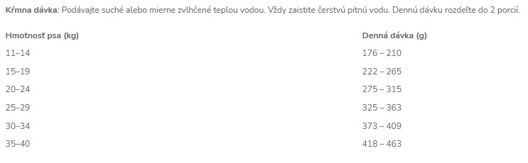 Kŕmna dávka: Podávajte suché alebo mierne zvlhčené teplou vodou. Vždy zaistite čerstvú pitnú vodu. Dennú dávku rozdeľte do 2 porcií.